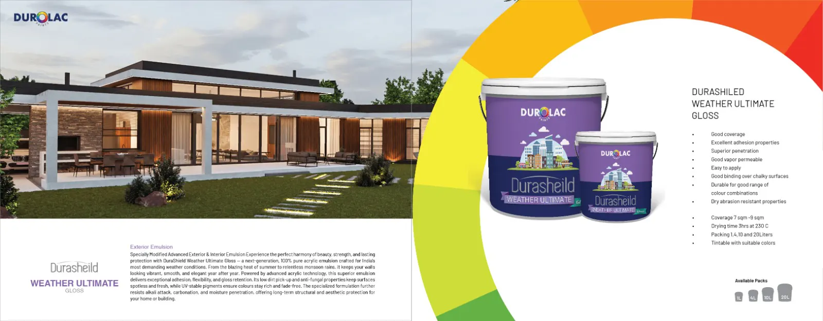 Specially Modified Advanced Exterior & Interior Emulsion Experience the perfect harmony of beauty, strength, and lasting protection with DuraShield Weather Ultimate Gloss — a next-generation, 100% pure acrylic emulsion crafted for India’s most demanding weather conditions. From the blazing heat of summer to relentless monsoon rains, it keeps your walls looking vibrant, smooth, and elegant year after year. Powered by advanced acrylic technology, this superior emulsion delivers exceptional adhesion, flexibility, and gloss retention. Its low dirt pick-up and anti-fungal properties keep surfaces spotless and fresh, while UV-stable pigments ensure colours stay rich and fade-free. The specialized formulation further resists alkali attack, carbonation, and moisture penetration, offering long-term structural and aesthetic protection for your home or building.