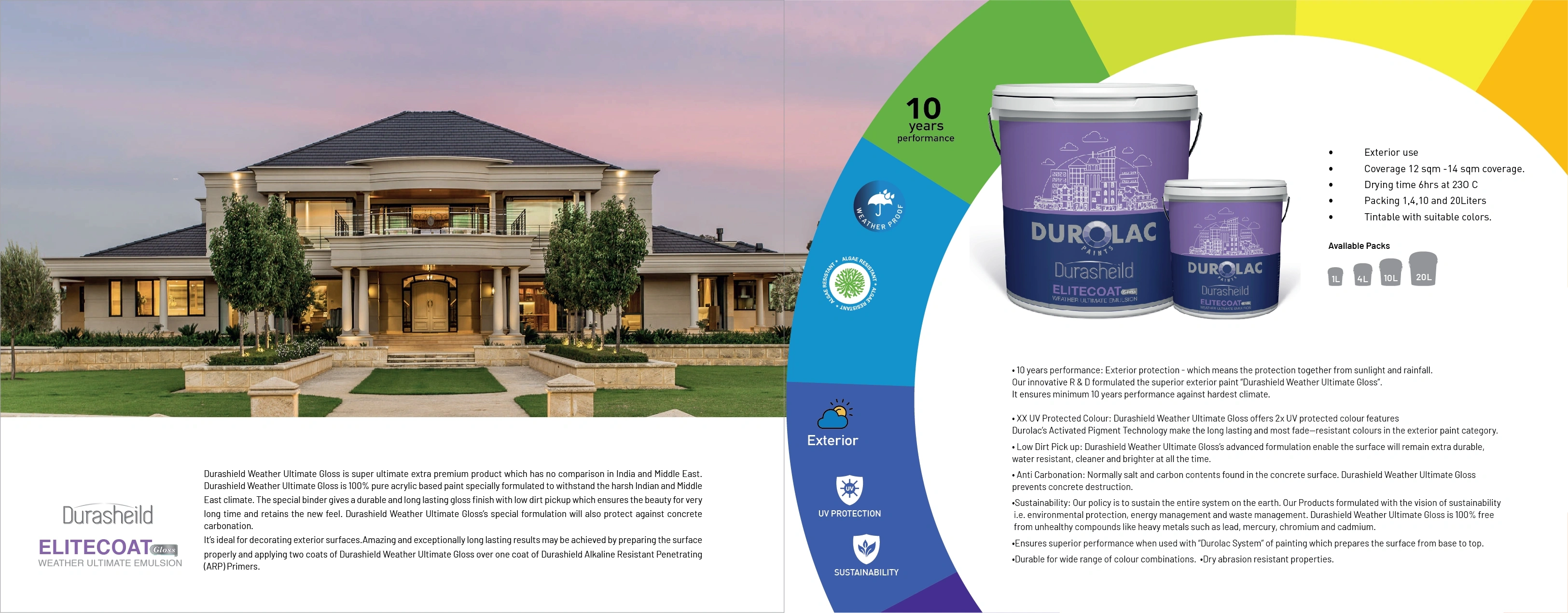 Premium-Economy 100% Pure Acrylic Exterior Emulsion DuraShield Elite Coat is a premium-quality exterior emulsion engineered with advanced 100% pure acrylic technology to deliver unmatched performance, beauty, and long-lasting protection. Designed to withstand all weather conditions, it ensures your exteriors remain bright, smooth, and stunning season after season. Formulated with a gloss, flexible acrylic binder, DuraShield Elite Coat provides a silky smooth finish and superior colour retention, even under harsh sunlight or heavy rainfall. Its anti-fungal and anti-algal shield keeps walls cleaner and fresher, while the UV-resistant pigments prevent fading, chalking, and surface degradation over time. DuraShield Elite Coat combines durability, gloss, and elegance—making it the perfect choice for homeowners and professionals seeking a long-lasting, high-performance coating that enhances architectural beauty.