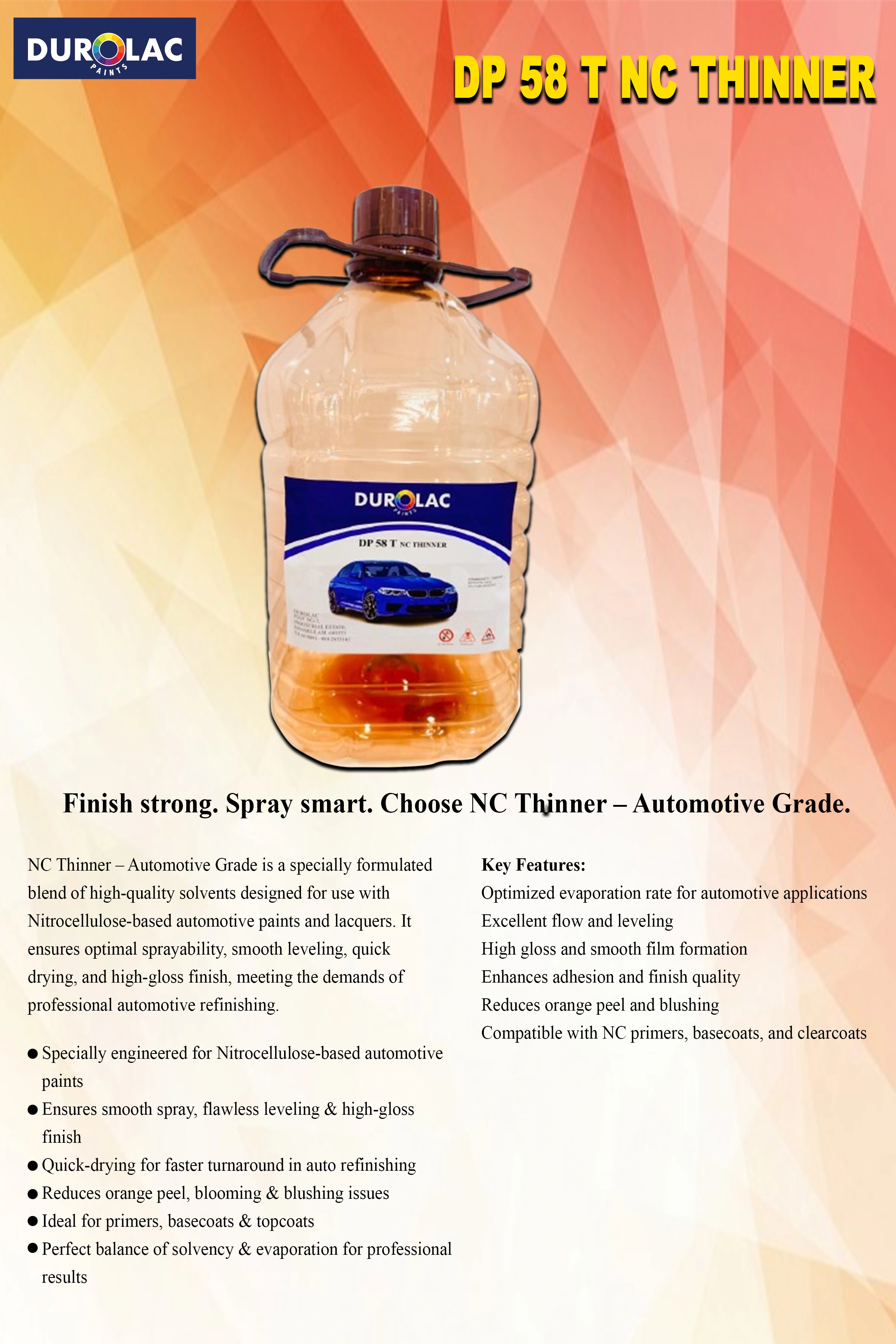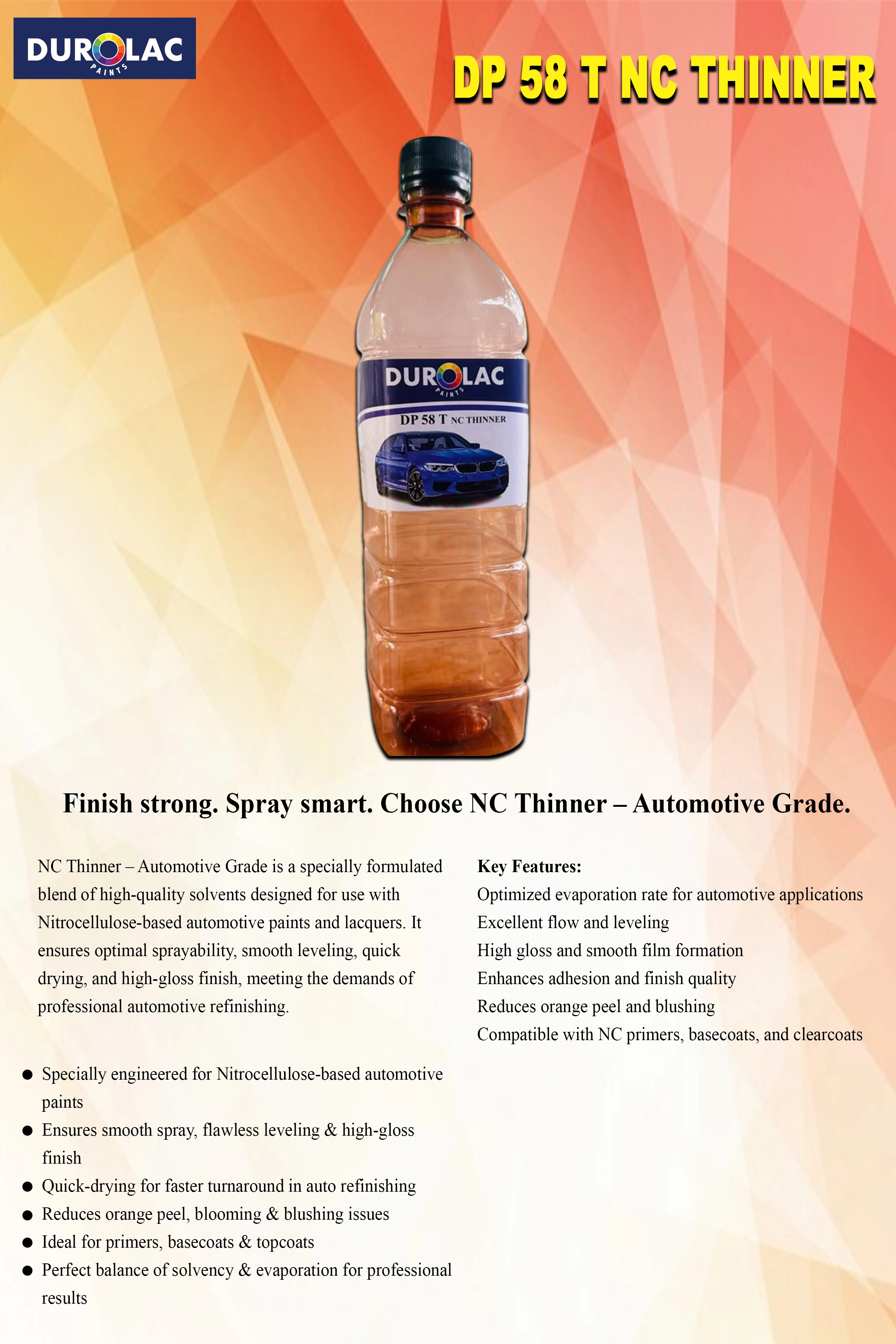 NC Thinner-Automotive Grade is a specially formulated blend of high-quality solvents designed for use with Nitrocellulose-based automotive paints and lacquers. It ensures optimal sprayability, smooth leveling, quick drying, and high-gloss finish, meeting the demands of professional automotive refinishing.