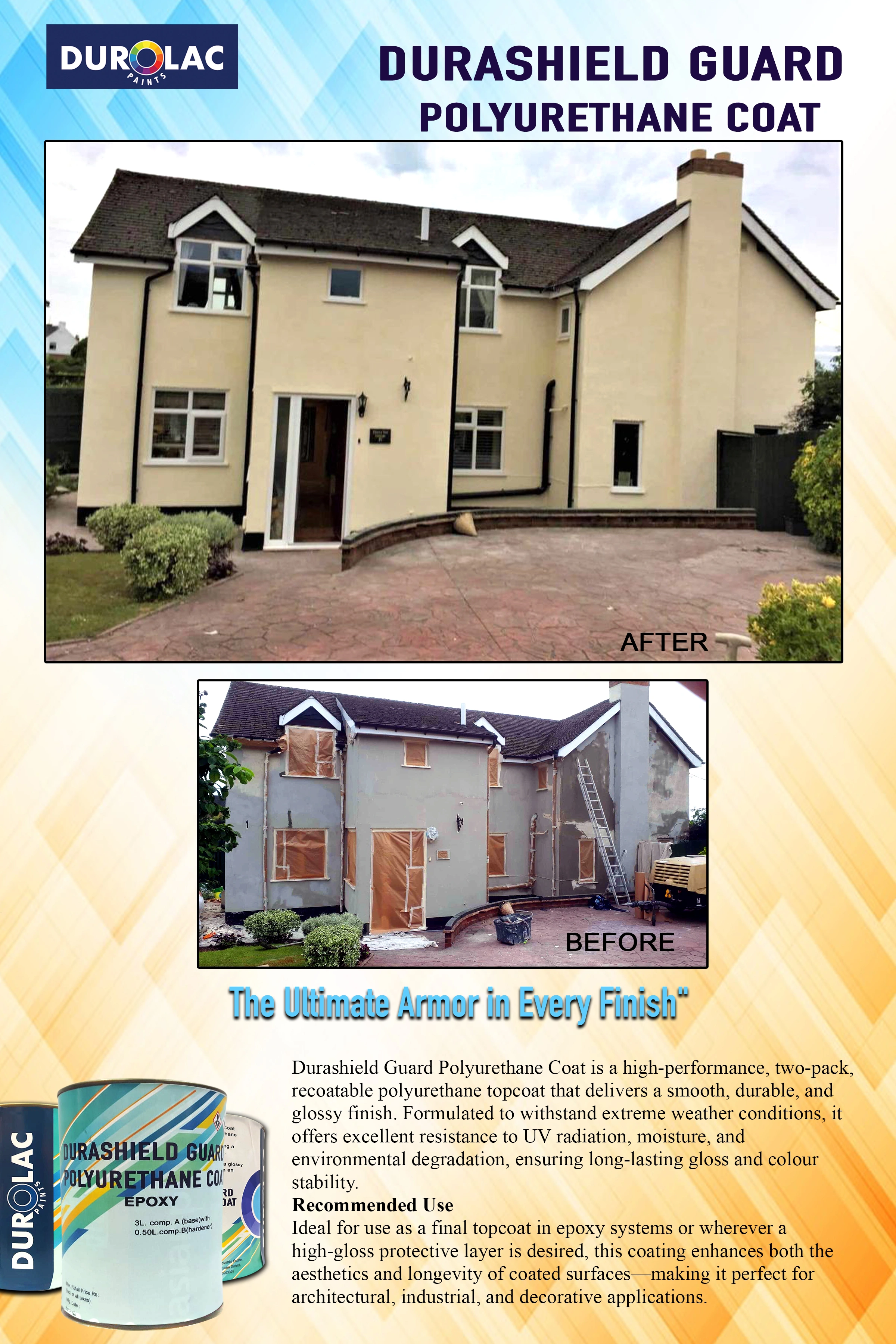 Durashield Guard Polyurethane Coat is a high-performance, two-pack, recoatable polyurethane topcoat that delivers a smooth, durable, and glossy finish. Formulated to withstand extreme weather conditions, it offers excellent resistance to UV radiation, moisture, and environmental degradation, ensuring long-lasting gloss and colour stability.