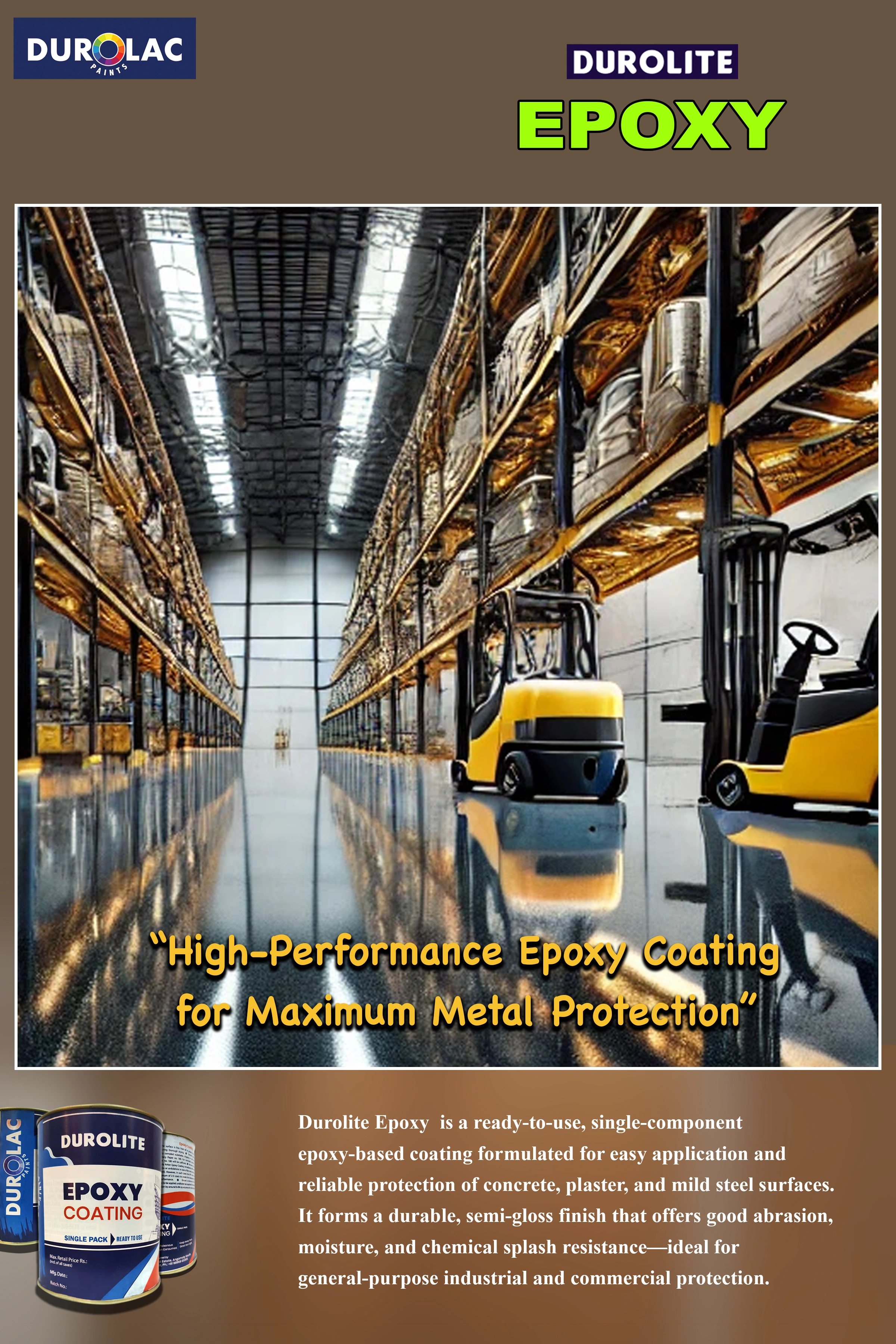 Durolite Epoxy is a ready-to-use, single-component epoxy-based coating formulated for easy application and reliable protection of concrete, plaster, and mild steel surfaces. It forms a durable, semi-gloss finish that offers good abrasion, moisture, and chemical splash resistance-ideal for general-purpose industrial and commercial protection.